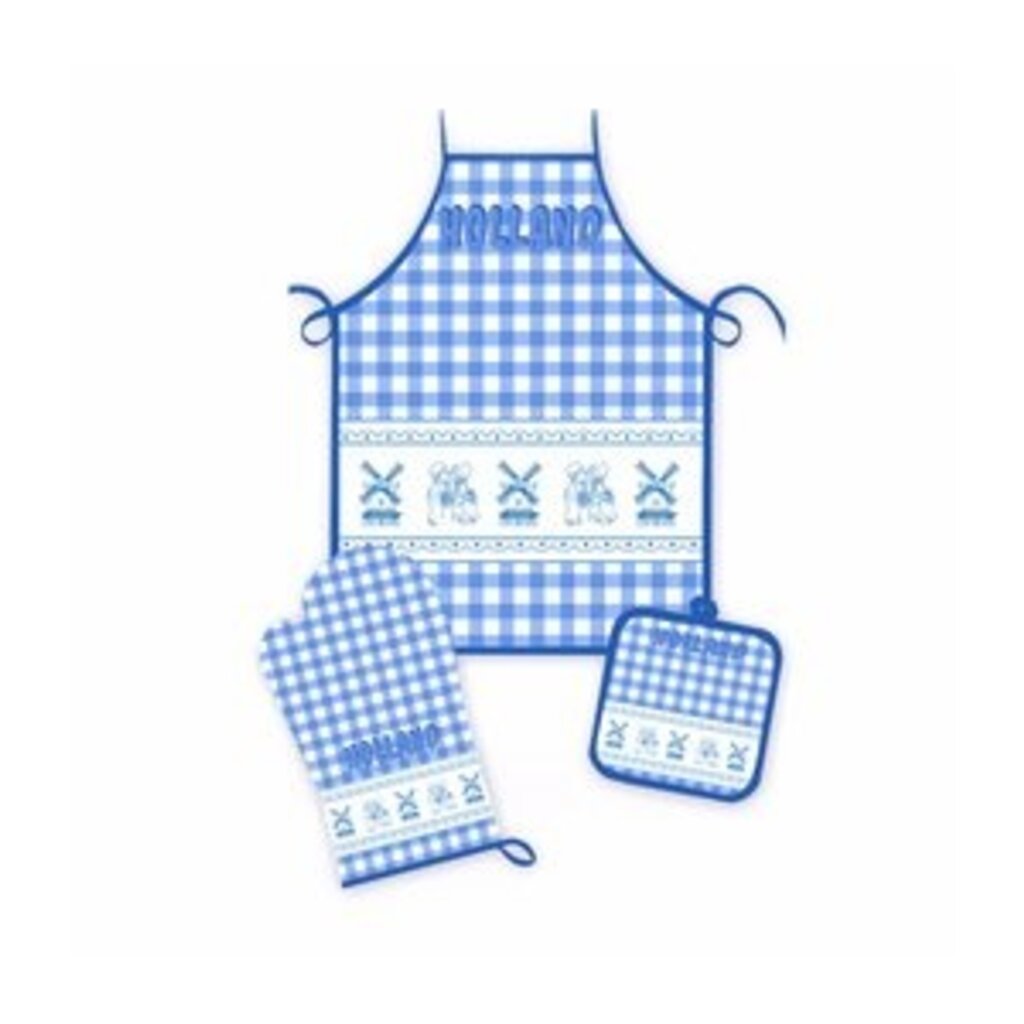 Das Set besteht aus einer Schürze, Topflappen und einem Topflappen