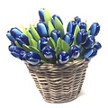 blaue Tulpen aus Holz in einem Korb