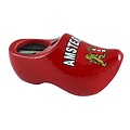 Rote Bleistiftspitzer in Form eines Holzschuh mit dem Wappen von Amsterdam. Der Bleistiftspitzer ist 8 cm lang.