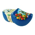 Souvenirs Clogs in der Farbe Blau mit Blumen in einer Umgebung mit einer Holländischen Windmühle.