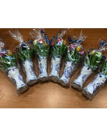 kleine hölzerne Tulpen in einer blauen Delfter Vase mit Logo