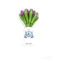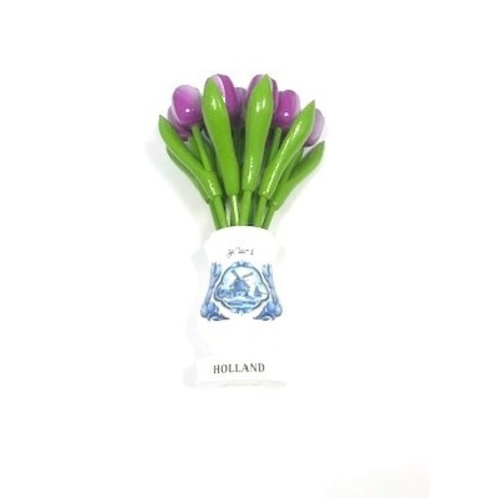 Blumenstrauß mit den schönsten lila Tulpen aus Holz in einer weißen Holzvase. Ideale künstliche Blumen für einen Wohnwagen oder ein Gartenzimmer. Sie müssen diese künstlichen Blumen nicht gießen und sie bleiben immer schön. Wenn Sie einen Wohnwagen damit anziehen, wird es sofort viel einfacher, darin zu leben, und sie nehmen wenig Platz ein.