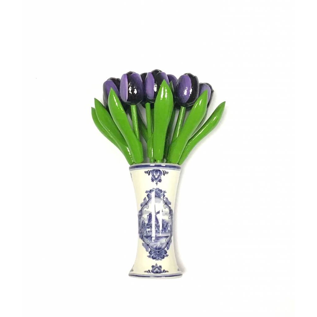 Hölzerne Tulpen dunkelviolett in einer Delfter blauen Vase
