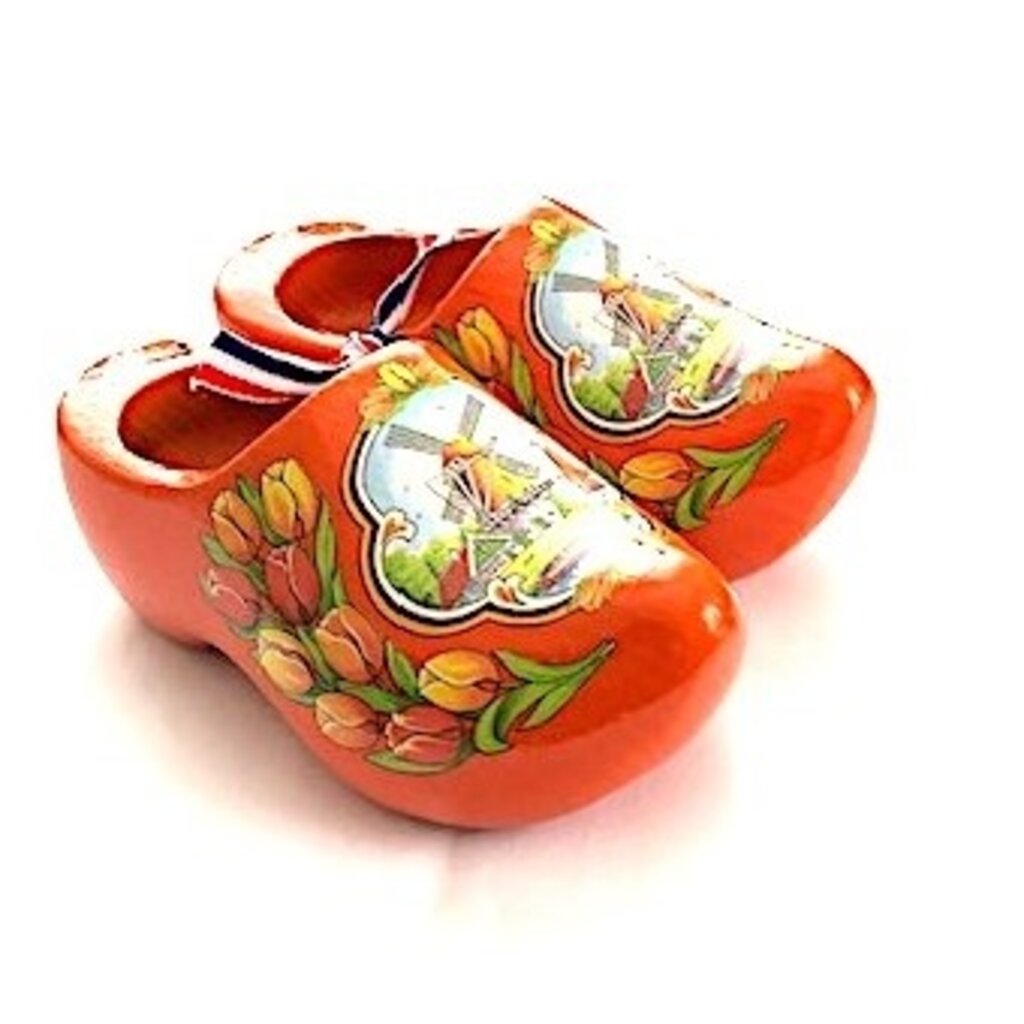 Souvenirclogs in der Farbe Orange in einer Umgebung mit einer Holländischen Windmühle.