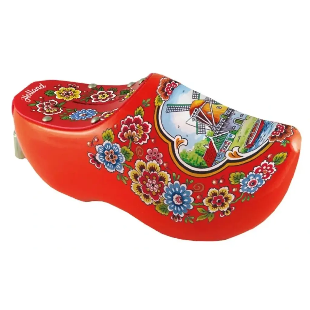 Bringen Sie einen Hauch von Holland in Ihr Zuhause mit dieser wunderschönen orangefarbenen Holzschuh-Spardose , die mit dem detailreichen Bild einer traditionellen holländischen Windmühle verziert ist. Diese einzigartige Spardose vereint Funktionalität und Dekoration: ideal zum Sparen von Münzen und als typisch holländisches Prunkstück in Ihrem Interieur.