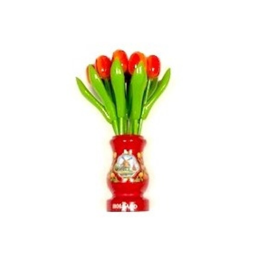 Bestellen Sie noch heute unsere orangefarbenen Tulpen aus Holz in einer roten Holzvase online im Clog Store!