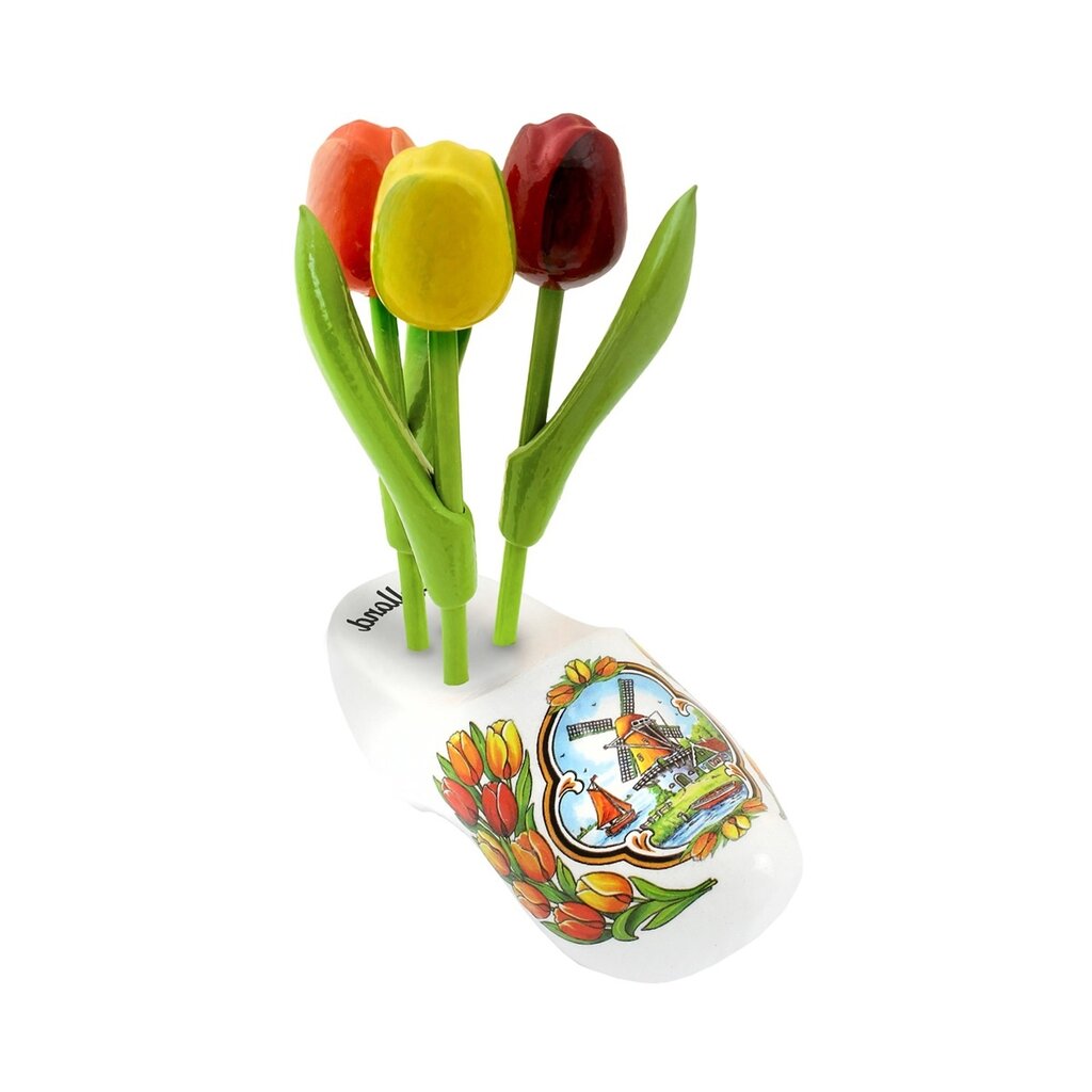 Bringen Sie mit diesen hölzernen Tulpen auf einem weißen Clog einen Hauch niederländischer Gemütlichkeit in Ihr Zuhause. Bestellen Sie dieses einzigartige Souvenir noch heute und überraschen Sie sich selbst oder jemand anderen mit einem Stück niederländischer Tradition!