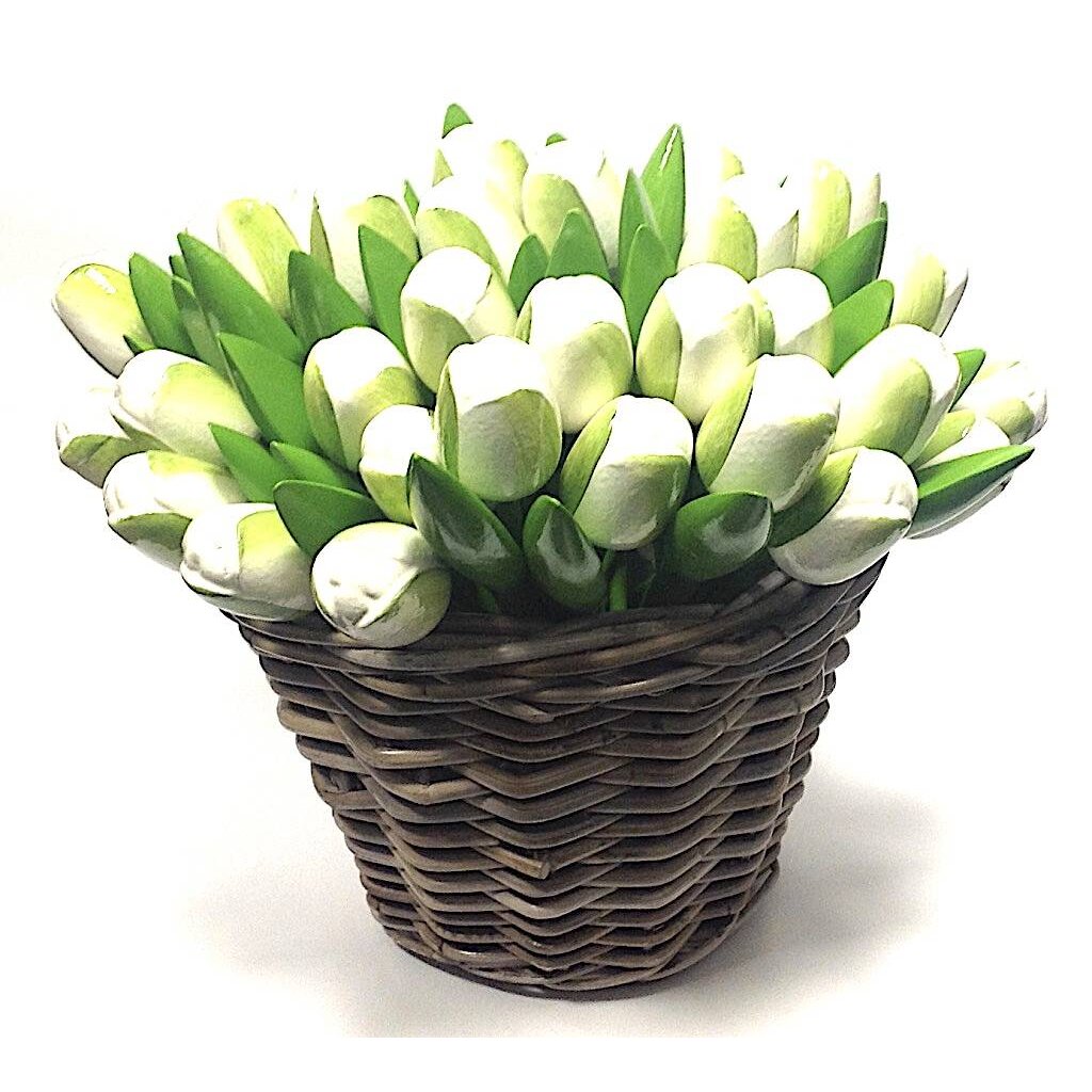 Weiße hölzerne Tulpen in einem Weidenkorb