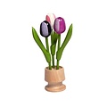 3 wooden tulip on one foot in the color dark purple-purple-white rose