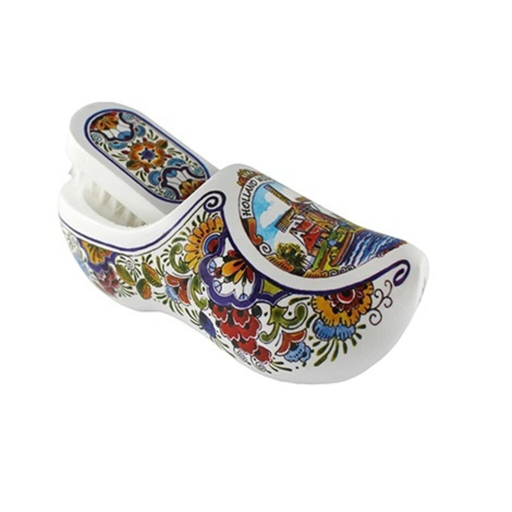 Original souvenir clogs with a brush in the color poly / white. They are 14 cm in size and feature an image of a windmill and flowers. In addition to looking great, they are also extremely functional. With the brush you can easily remove the hair of the pets from your clothes and the brush can also be used to polish your leather shoes. At the back of the souvenir clog there is a small hook to easily hang it as a decoration on a wall.