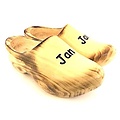 Clogs of which the outside is burned with a gas burner so that they get a flamed appearance. The clog is not burned on the instep, but is kept white. The name and/or text supplied by you will be applied to this. They are then provided with several transparent layers of lacquer.