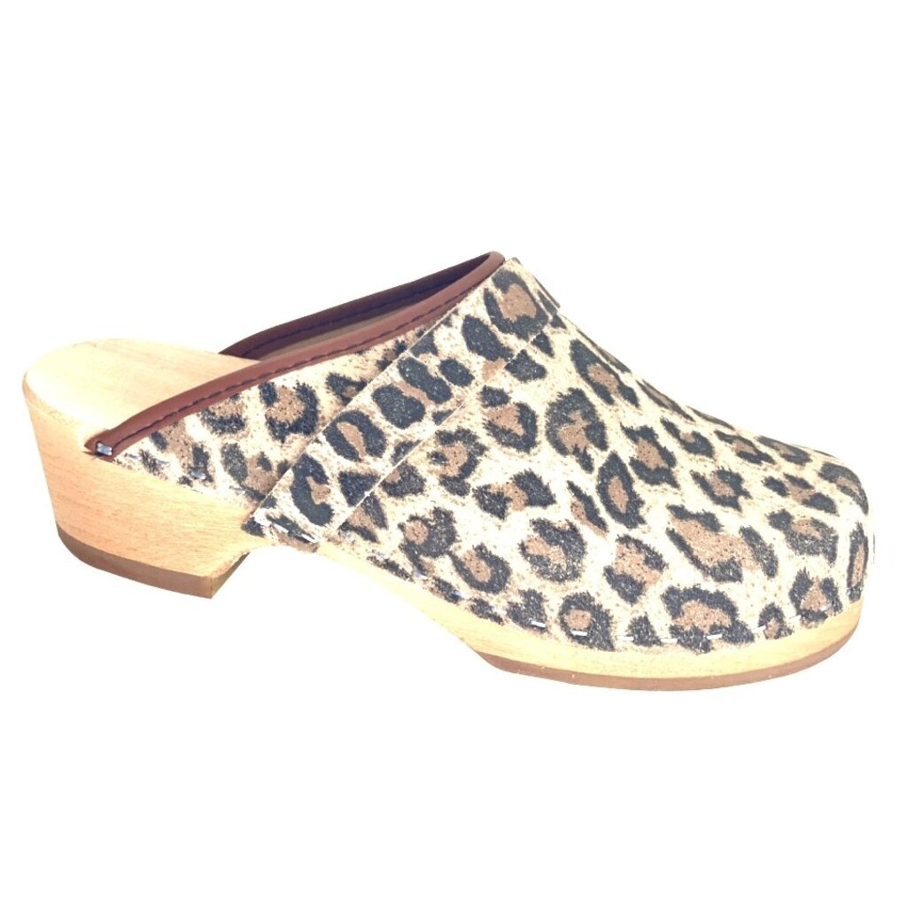 A Dutch manufacturer of Swedish clogs. They are made with a wooden insole with a PVC outsole. The PVC outsole dampens the sound, which slightly reduces the loud noise of wooden clogs. The upper is made of genuine leather, so you will notice this immediately when you take them on and off. The open heel makes this very easy. The upper is provided with a leopard print.