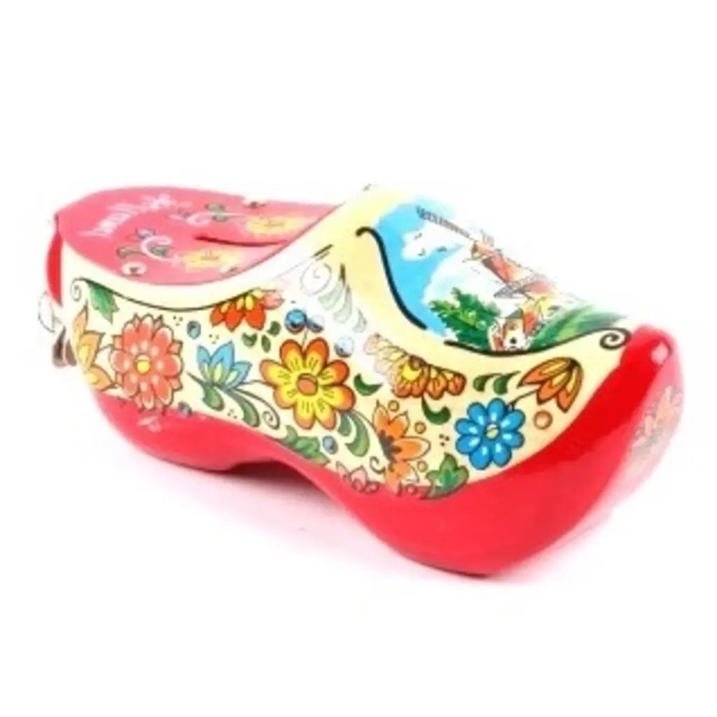 Original Piggy bank clog with a red sole. This product is produced in a Dutch factory from the best quality wood. They are 14 cm in size and are fitted with a plastic lid on the top sides with a slot. The back has a lock with 2 keys. We have included this variant in our range, because the color combination makes this a must-see.