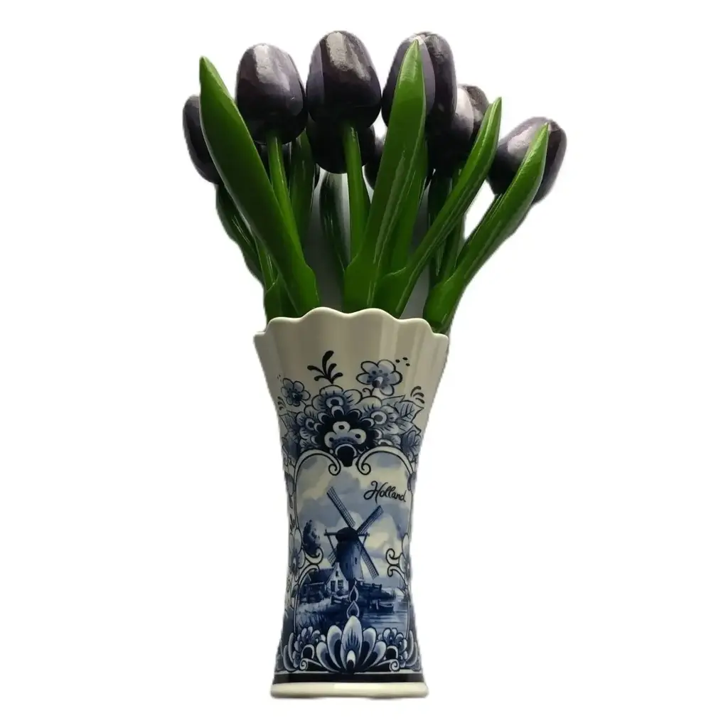 Bring a stylish and timeless look into your home with our dark purple wooden tulips , placed in a classic Delft blue vase . Each tulip is crafted from high-quality wood and expertly painted in a rich, dark purple hue that provides year-round color, maintenance-free.