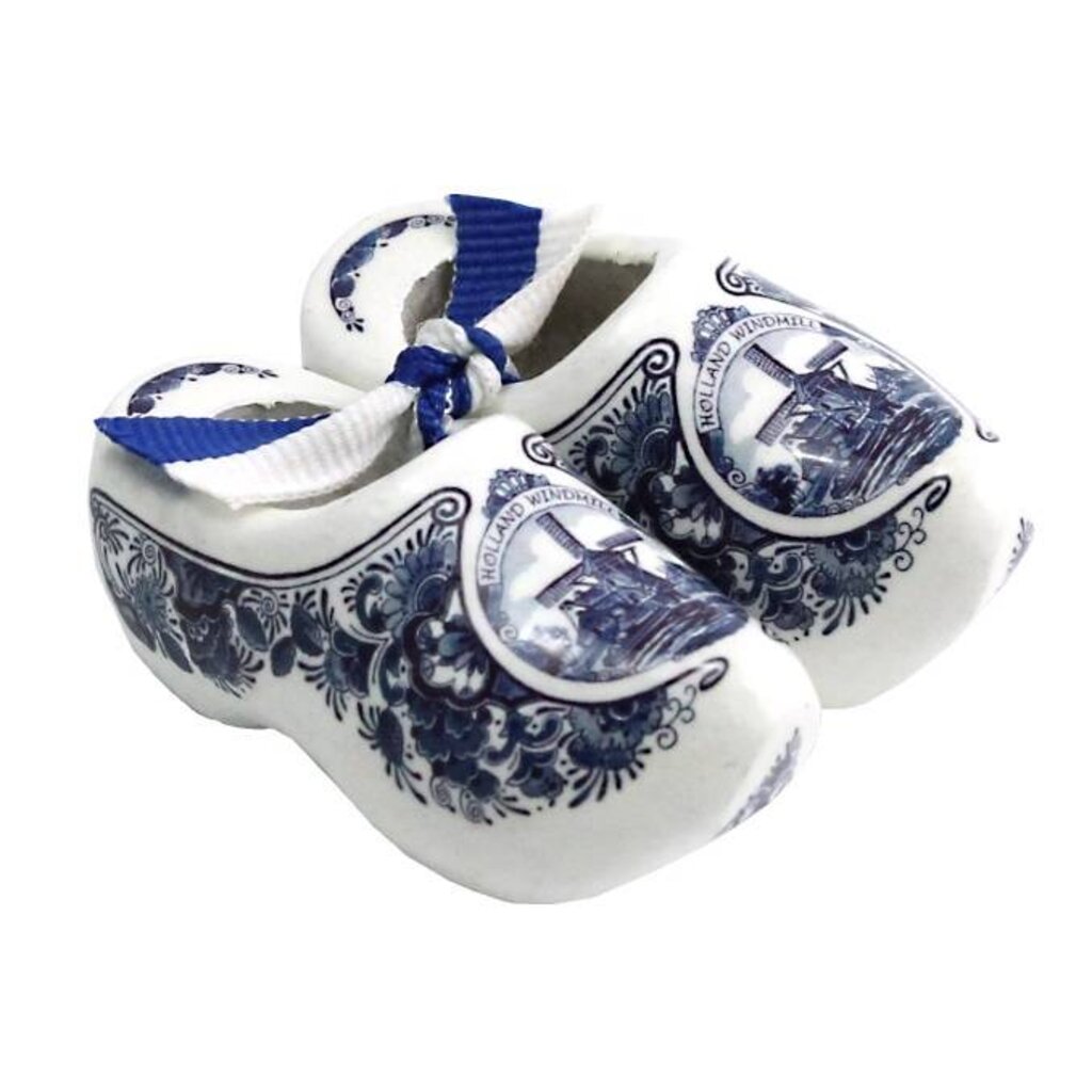 Souvenirclogs in the color Delft blue with flowers and a windmill.