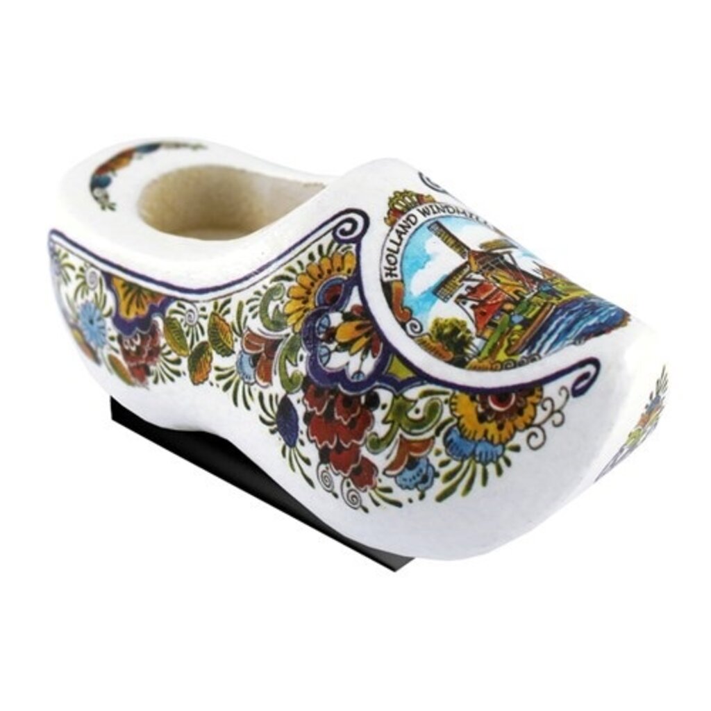 This white wooden magnetic clog with a poly windmill motif is a real Dutch object and should certainly not be missing from your collection of souvenirs.