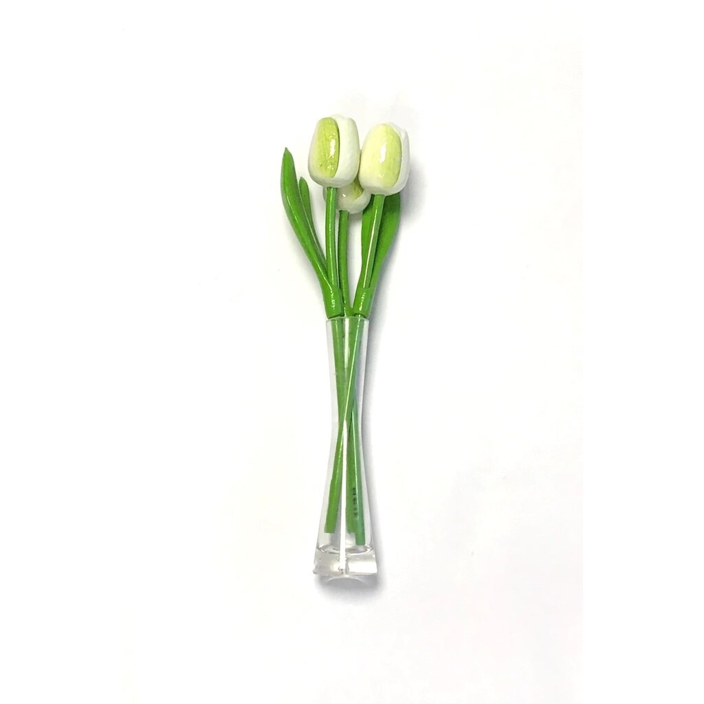 Bring a touch of Dutch class into your home with these beautiful white wooden tulips in a glass vase . With their timeless look, these handcrafted tulips are a stylish addition to any interior. Perfect as decoration, a souvenir, or an original gift with a quintessential Dutch touch.