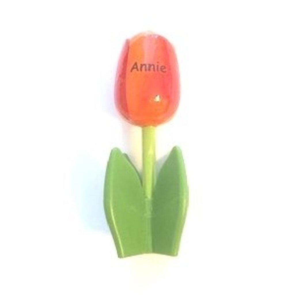 We have included 11 beautiful colors in our range from which you can choose. The tulip bulb is made of wood under which a plastic leaf in the color green has been applied. The total height is 14 cm.