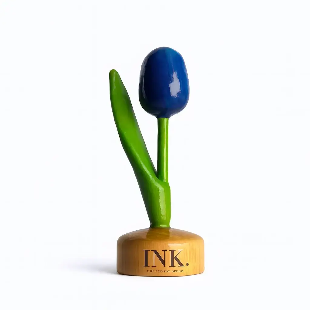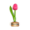 Wooden tulip with logo on pedestal in various colors