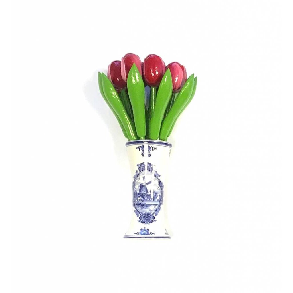 wooden tulips in red-white in a Delft blue vase