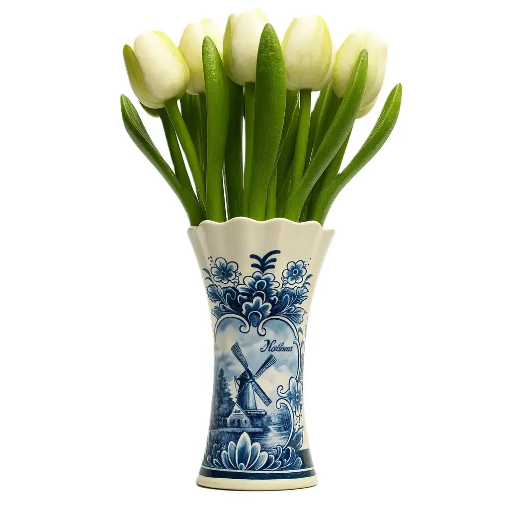 The accompanying vase is a work of art in itself: crafted from ceramic and decorated with classic blue motifs and an atmospheric scene of a Dutch windmill. The word "Holland" proudly adorns the vase, making this arrangement a perfect souvenir or gift for lovers of Dutch culture.