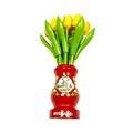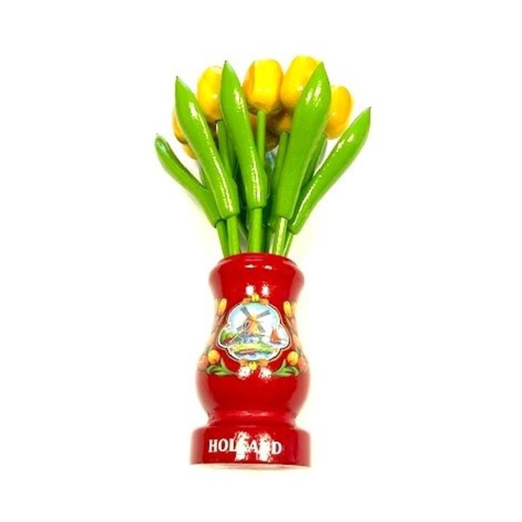 Bestel onze mooie gele houten tulpen in een rood vaasje vandaag online.