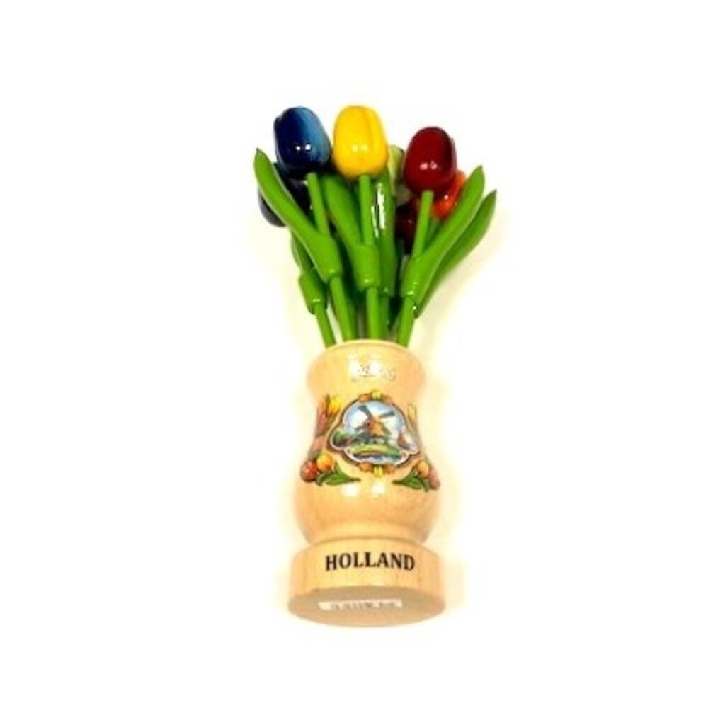 Uniek samengesteld boeket houten tulpjes in 9 schitterende kleuren in een houten vaasje. Bestel ze als souvenir als een blijvende herinnering aan het mooie Nederland. Ze worden direct uit voorraad geleverd zodat u nooit lang hierop hoeft te wachten. U kunt ze natuurlijk ook af komen ahalen. In verband met onze aanwezigheid is het raadzaam om even een telefoontje te plegen zodat u niet voor een gesloten deur komt.