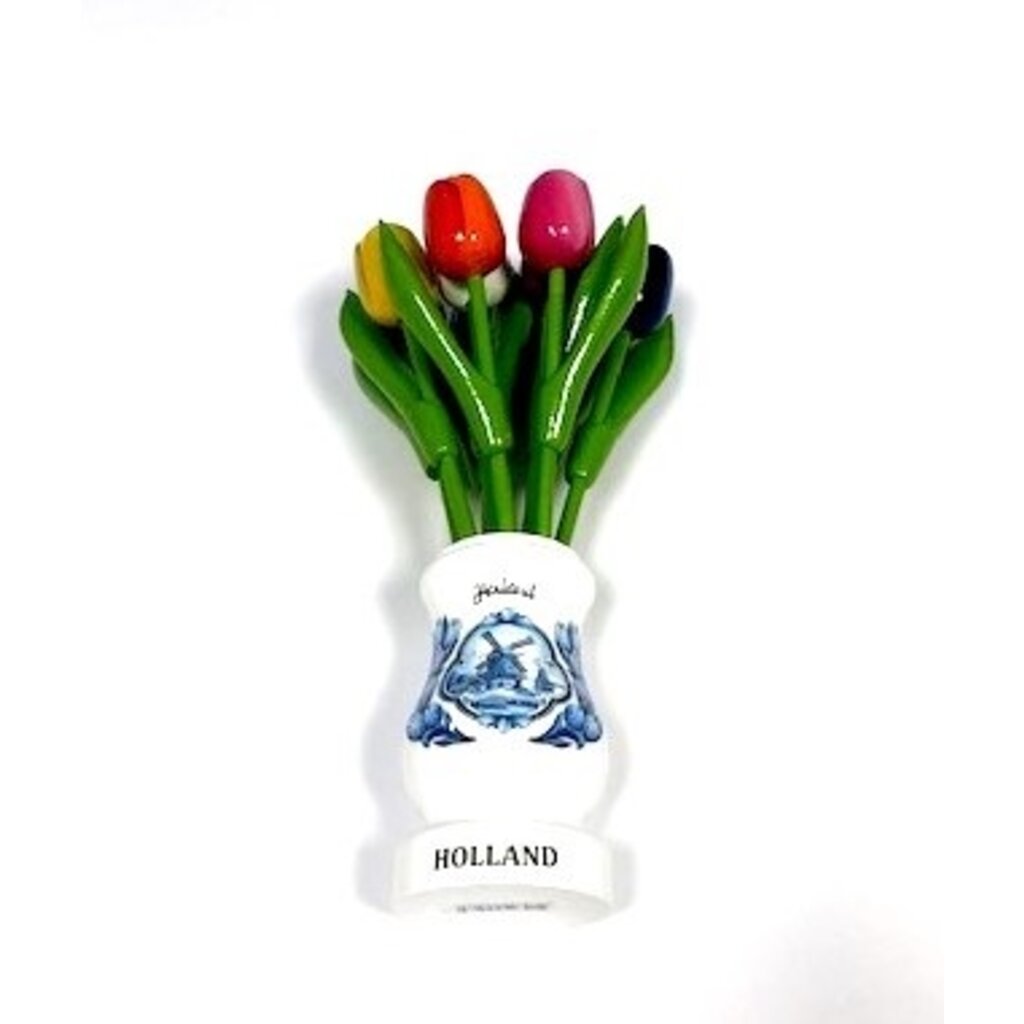 Bestel onze mooie houten tulpen in gemengde kleuren in een wit vaasje vandaag online.