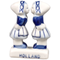 Twee Delftsblauwe porseleinen boerinnetjes die innig staan te zoenen op een sokkel.