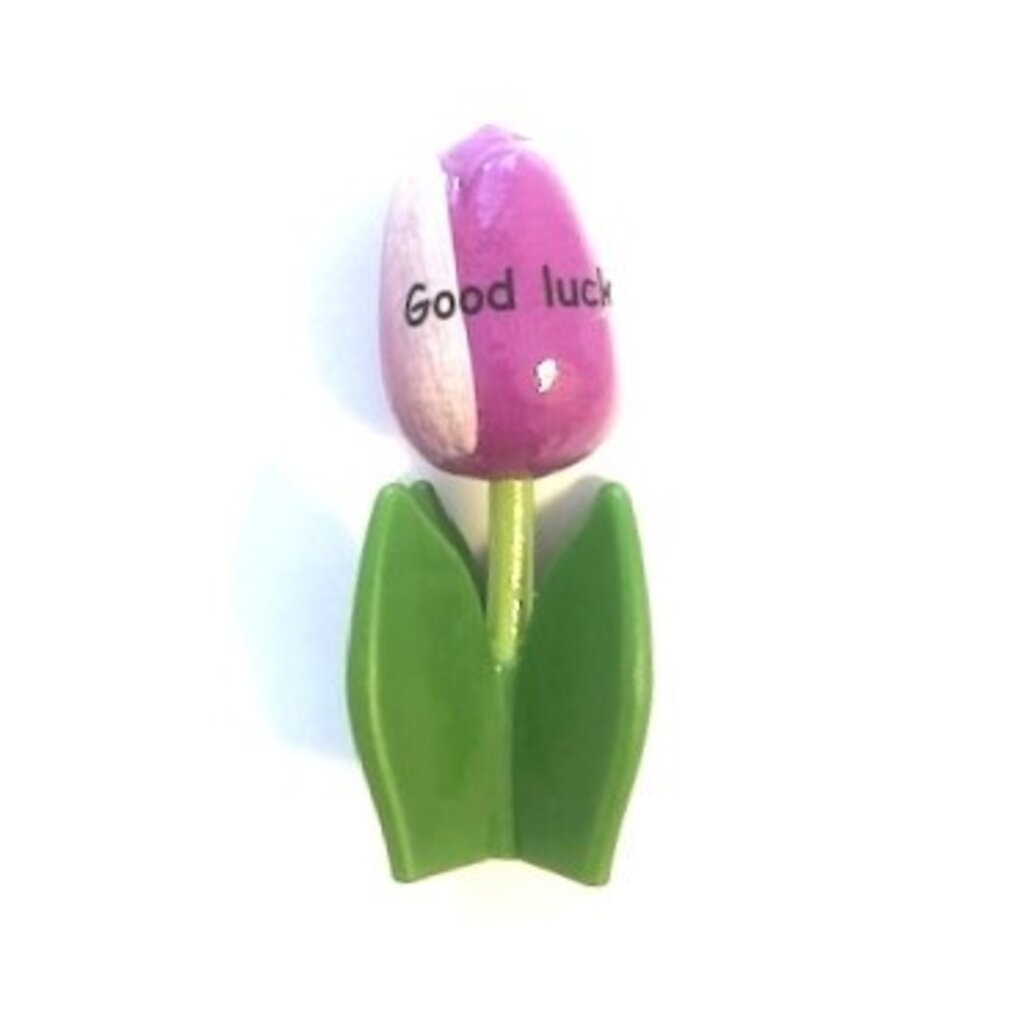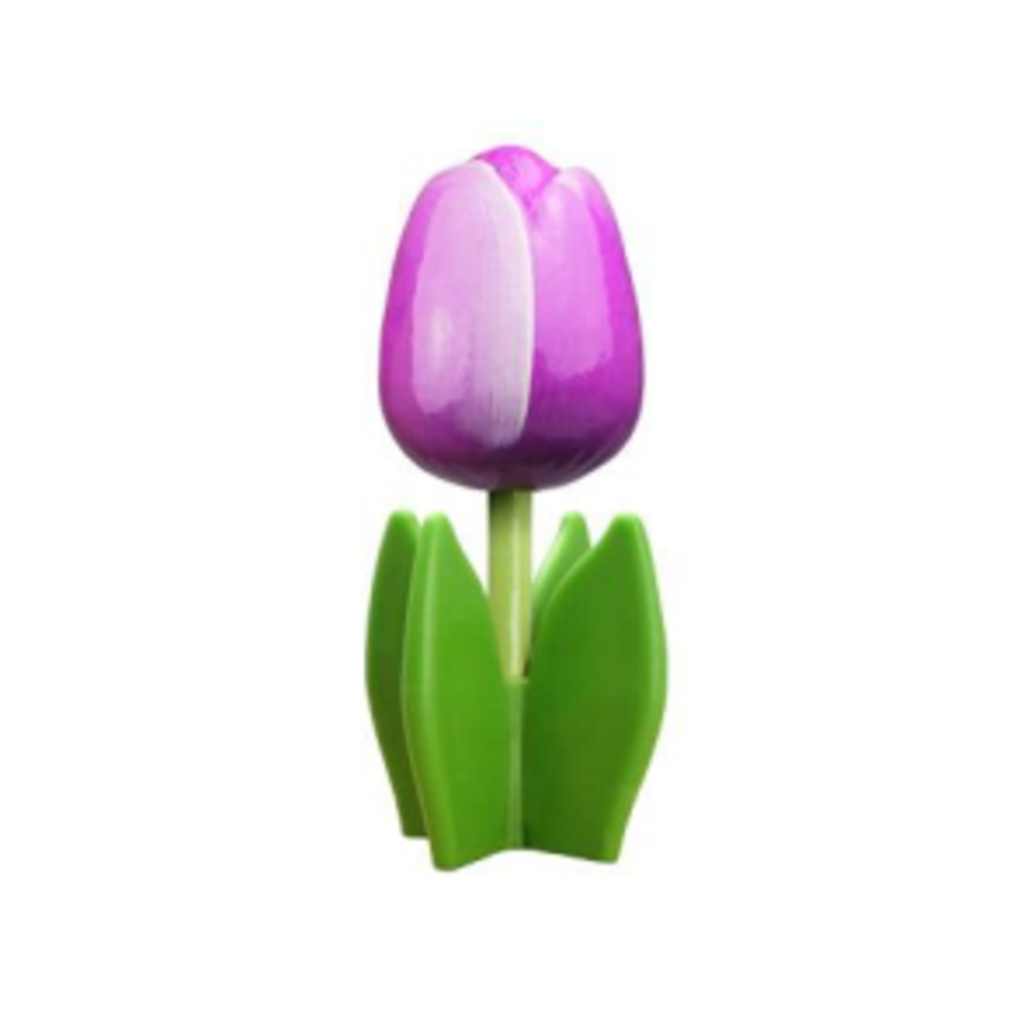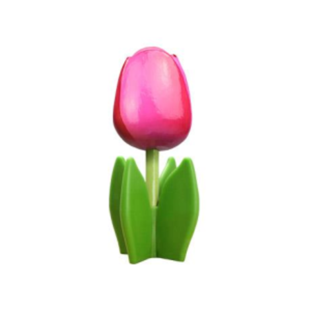 De tulp is gemaakt van hout en is leverbaar in vele mooie kleuren. Het blad is uitgevoerd in een kunststof in de kleur groen. De De totale hoogte van tulp en blad bedraagt ongeveer 14 cm.
