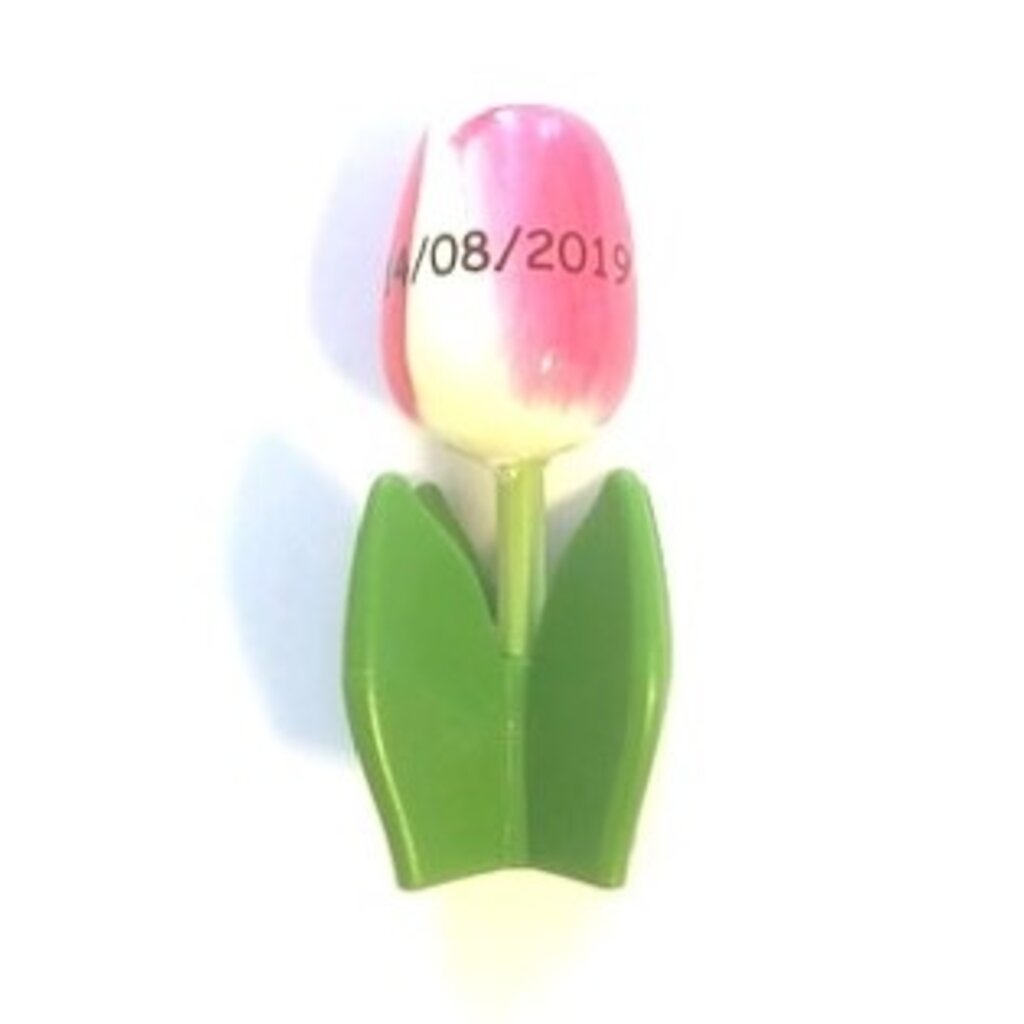 Tijdens het bestelproces kunt u de kleur van de houten tulpen en u kunt de tekst ingeven.