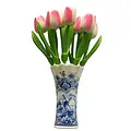 De houten tulpen zijn met zorg vormgegeven en hebben een zachte wit-roze kleur die rust en verfijning uitstraalt. In combinatie met de klassiek gedecoreerde Delfts blauwe vaas ontstaat een harmonieus geheel dat perfect past in zowel een landelijk, klassiek als modern interieur.