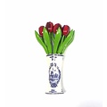 kleine houten tulpen in de kleur rood in een Delfts blauwe vaas