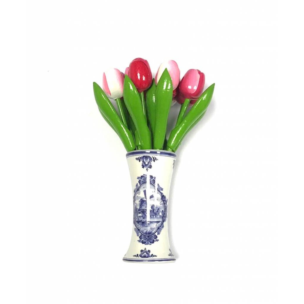 Kleine houten tulpen in gemengde kleuren roze in een Delfts blauwe vaas