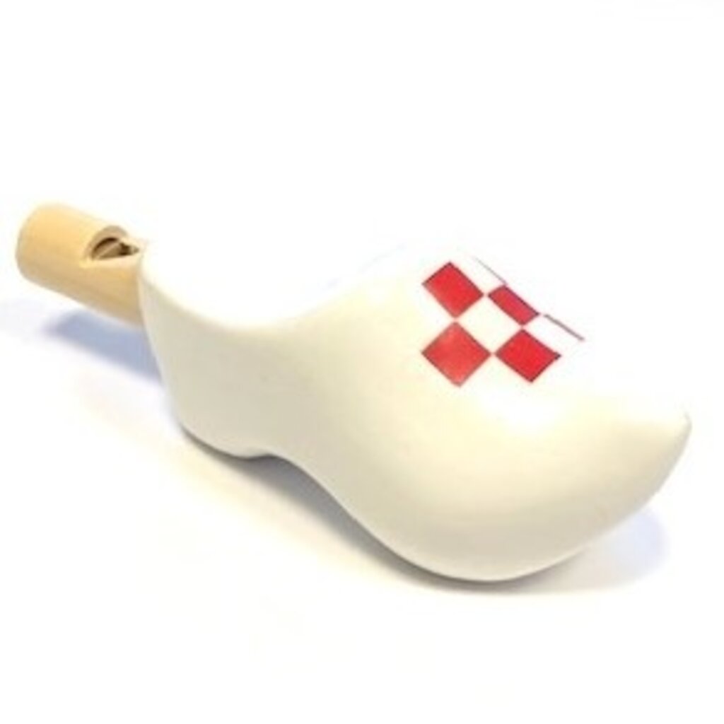 De leukste souvenirs in de vorm van een klomp met een fluitje waarop een afbeelding van een vlag is aangebracht.