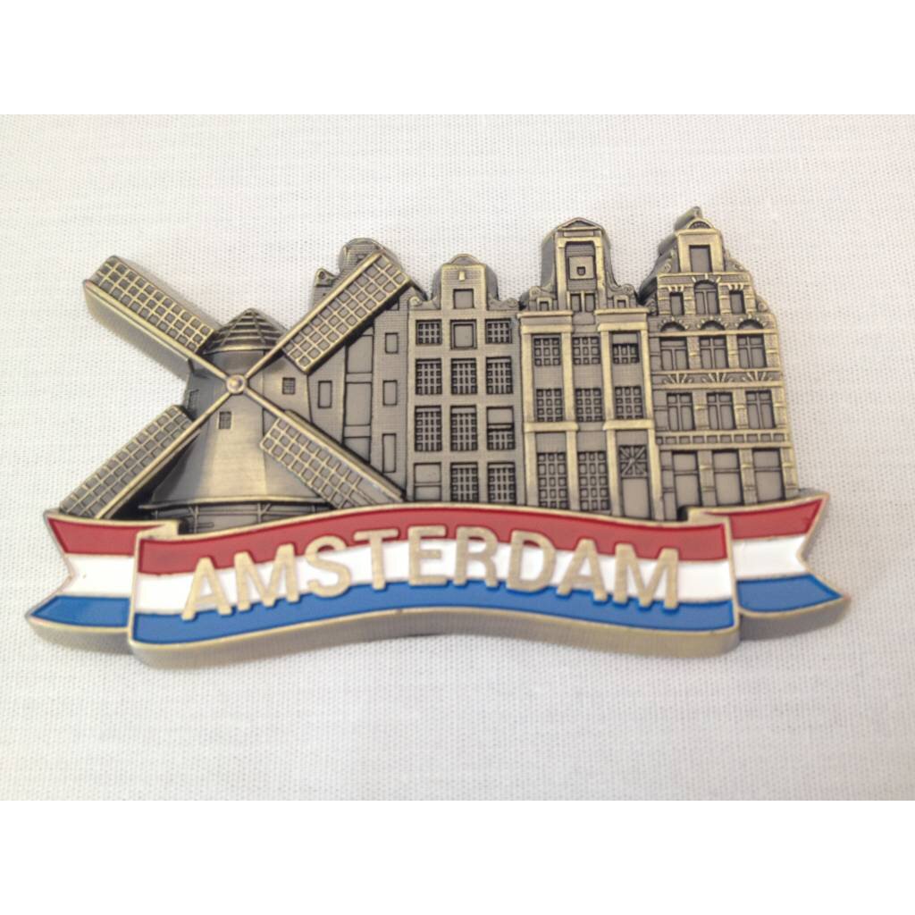 Magneet met de tekst 'Amsterdam' en enkele typisch Nederlandse voorwerpen.