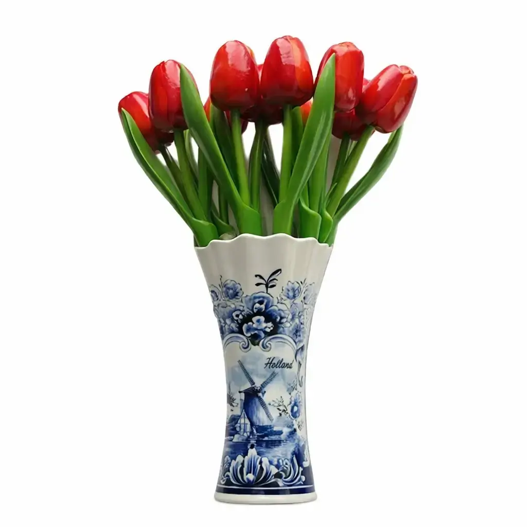 Houten tulpen zijn een iconisch Hollands product, dat traditie en innovatie combineert. De Delfts blauwe vaas is al eeuwenlang een symbool van Nederlands cultureel erfgoed. Samen vormen ze een prachtig samenspel van vakmanschap, traditie en moderne duurzaamheid.