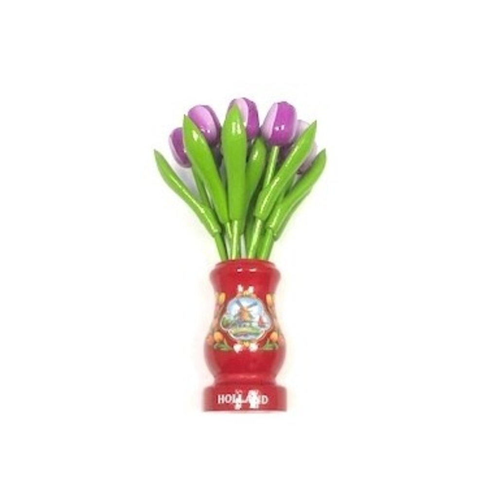 Bestel onze mooie paarse houten tulpen in een rood vaasje vandaag online voor een snelle verzending.
