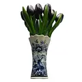 Donker paars houten tulpen in een Delfts blauwe vaas