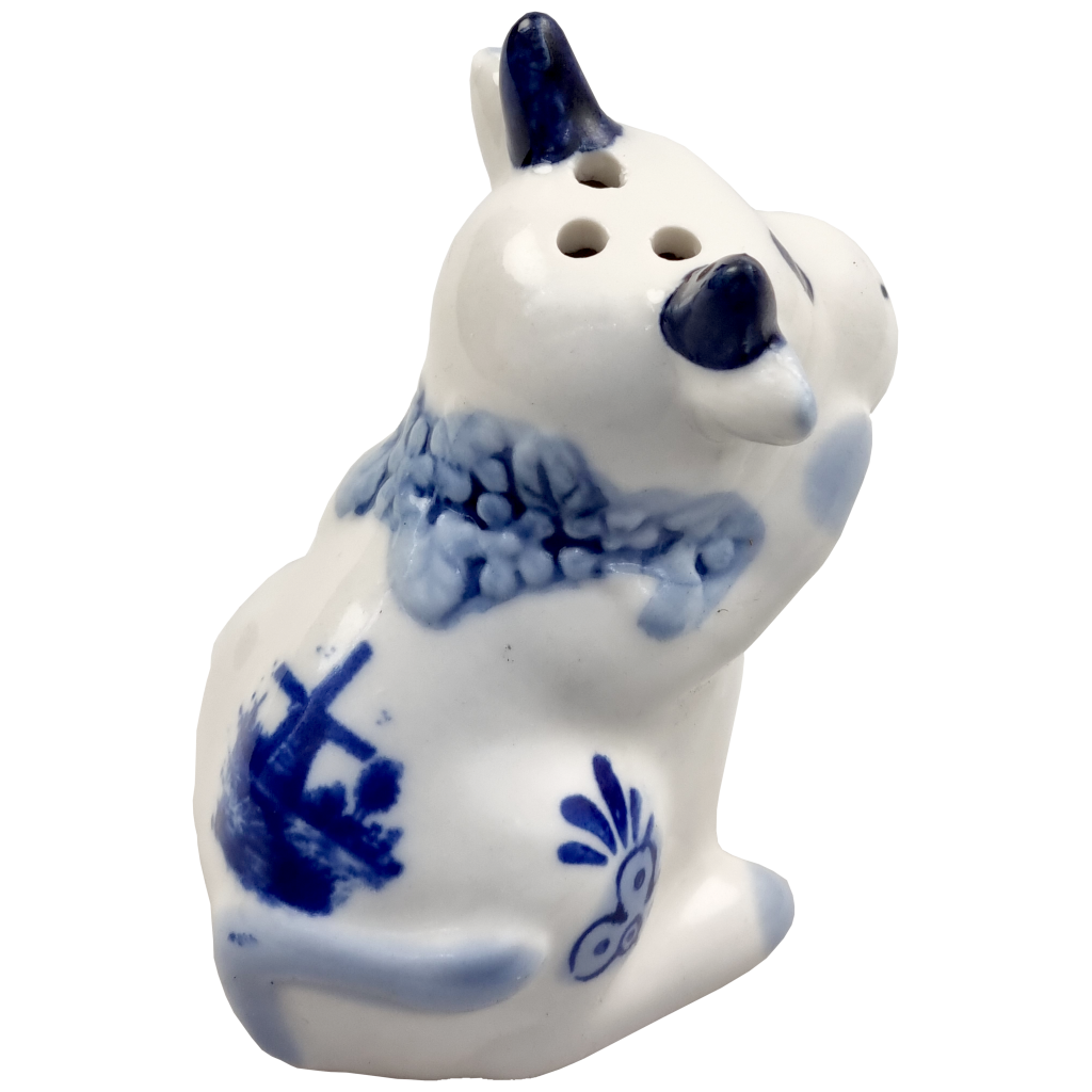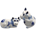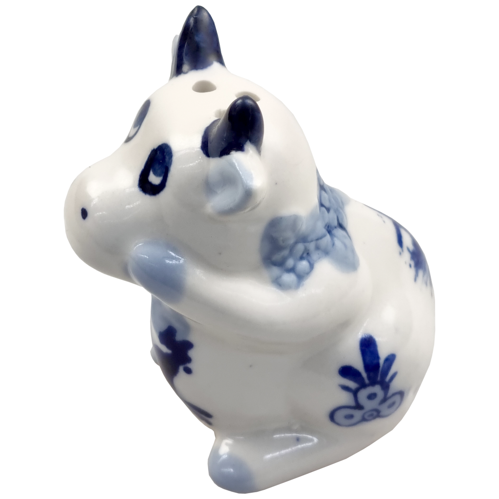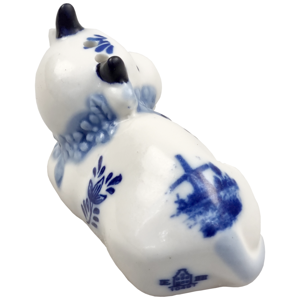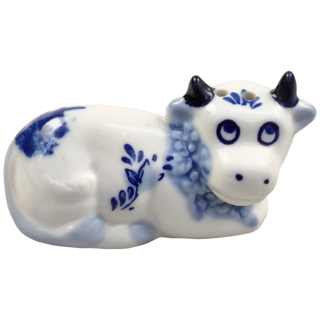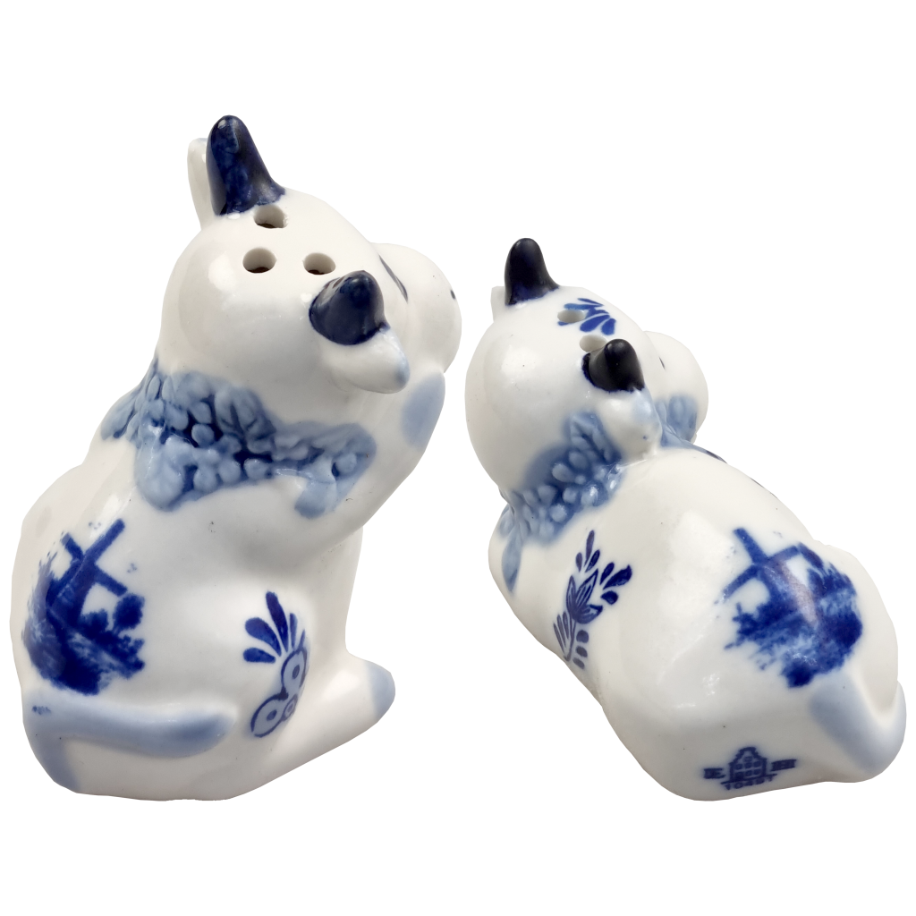 Zeer schattige set Delftsblauwe Peper & Zout koetjes, waarvan er eentje ligt en de ander zit. Hierdoor is goed te onderscheiden in welk van de twee het zout of de peper zit.