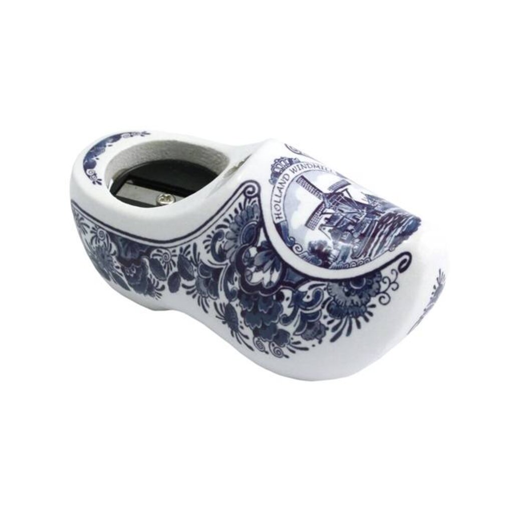 Deze souvenirsklomp wordt afgewerkt met witte verf en met een versiering van een delftsblauwe molen en bloemen.