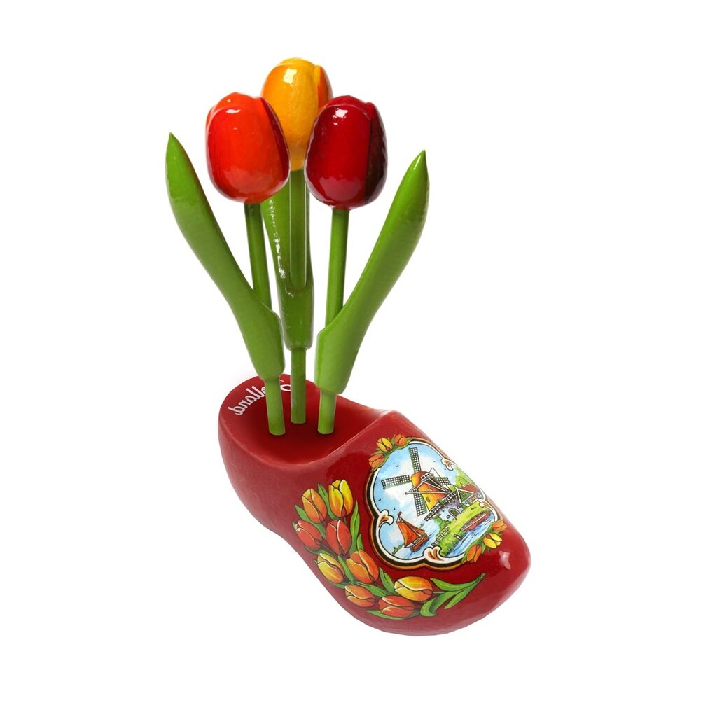 Voeg een vleugje Nederland toe aan je interieur of verras iemand met dit unieke cadeau. Bestel nu de rode klomp met 3 houten tulpen en geniet van een kleurrijk souvenir dat nooit verwelkt!