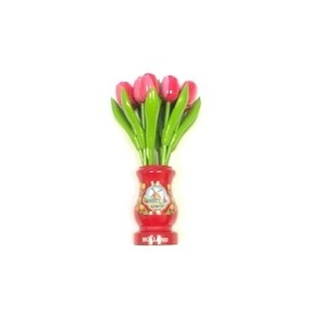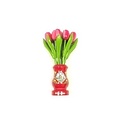 Bestel onze mooie houten tulpen in de kleur roze-wit in een rood vaasje vandaag online.