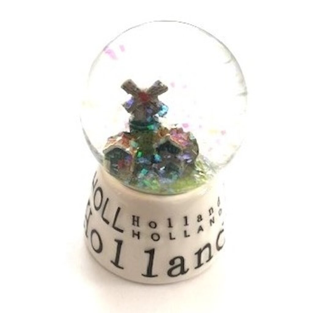Sneeuwbol met een voet van wit porselein. Deze is voorzien met een dorpsgezicht van een Hollandse molen met rondom enkel huisjes. Op de rand van de voet is de in zwarte letters tekst Holland aangebracht.