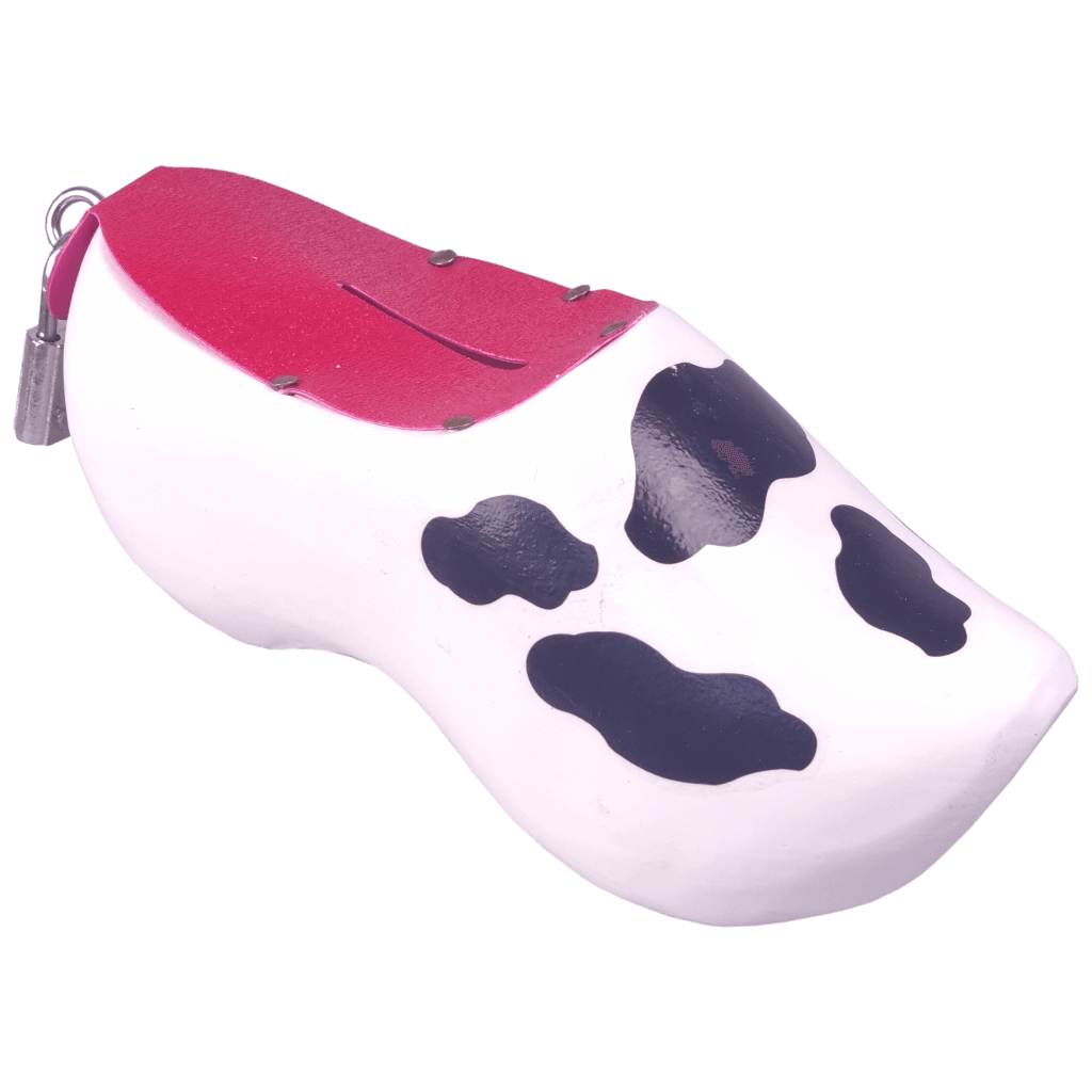Originele klompen spaarpot om de kleur wit. Deze producten worden gemaakt in Nederland van de beste kwaliteit beuken hout en ze afgewerkt met witte verf met koeienvlekjes . Ze hebben een lengte van 14 cm en zijn voorzien van een kunststof deksel aan de bovenzijden met gleuf. Het souvenirs klompje wordt aan de achterzijde voorzien van een slot met 2 sleutels.