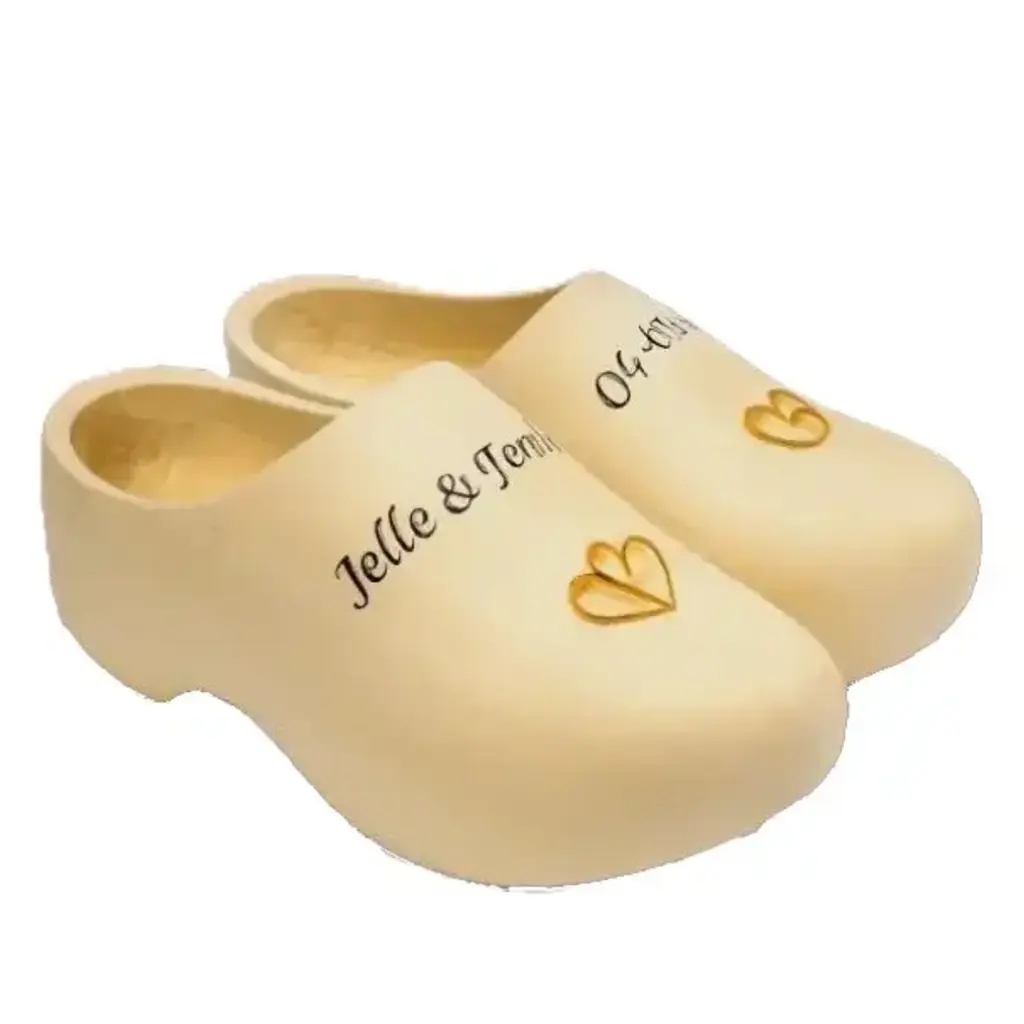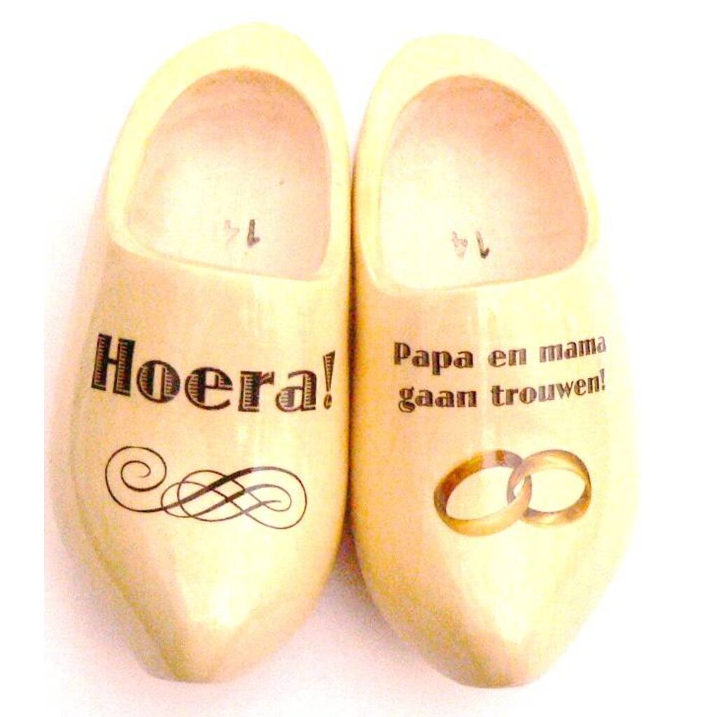 Verras het bruidspaar met dit uniek Hollands schoeisel met tekst, ringen of een hartje.